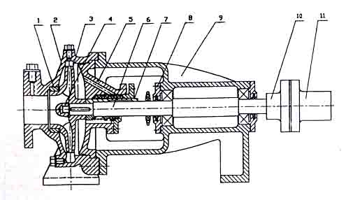 1.密封環(huán)2.泵體3.葉輪4.葉輪螺母5.泵后蓋6.軸7.軸套8.軸承蓋9.托架10.泵聯(lián)軸器11.電機聯(lián)軸器