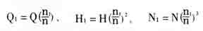 (6)、不得任意提高泵的轉(zhuǎn)速,但可降低轉(zhuǎn)速使用,本型泵額定轉(zhuǎn)速n,流量Q,揚(yáng)程H,功率N,倘若降低轉(zhuǎn)速為n1,則流量為Q1,揚(yáng)程為H1,功率為N1,可用下列公式換算:
