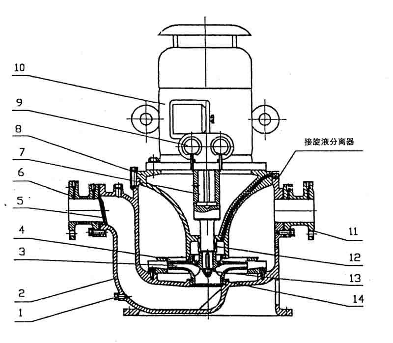 8、泵蓋 9、儀表 10、電機(jī) 11、出口接管 12、機(jī)械密封 13、葉輪螺母