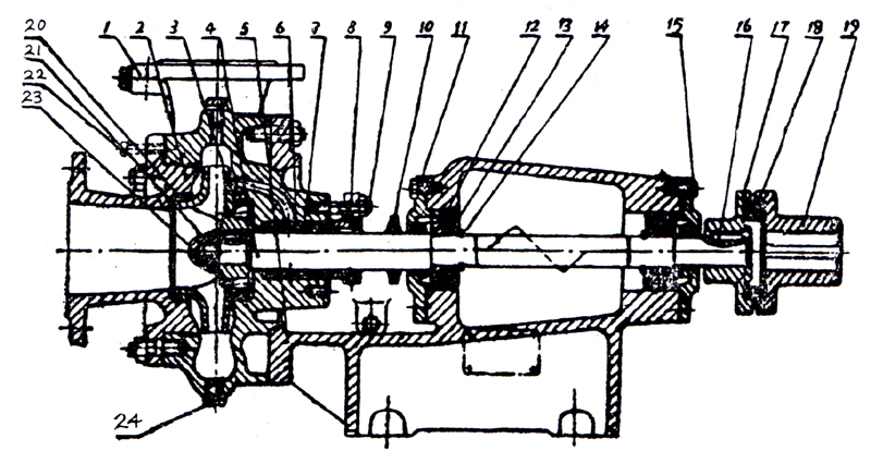 1.泵體 2.泵蓋 3.葉輪 4.軸 5.托架 6.填料套
